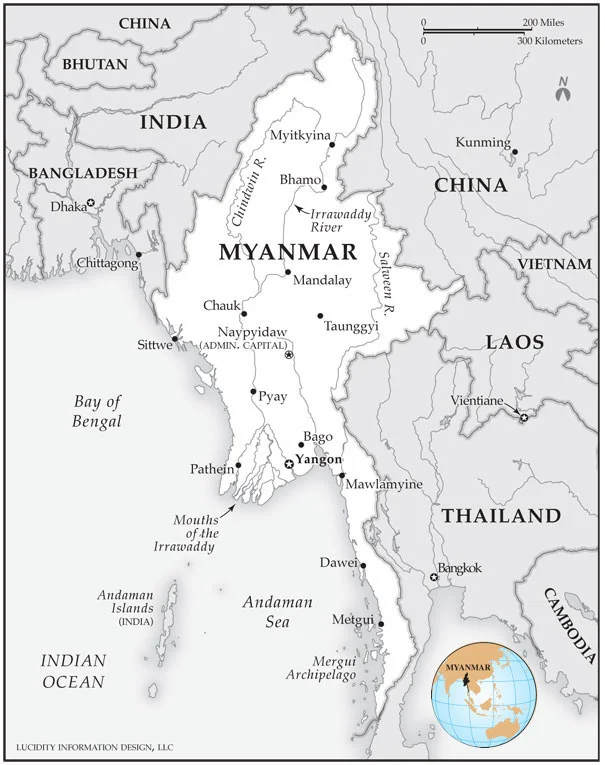 Myanmar is the largest country in mainland southeast Asia, slightly smaller than the state of Texas. The country consists of 14 regions and states. It shares borders with the Indian Ocean and a number of countries including Bangladesh, India, China, Laos and Thailand. Below is a breakdown of the five main geographic areas.